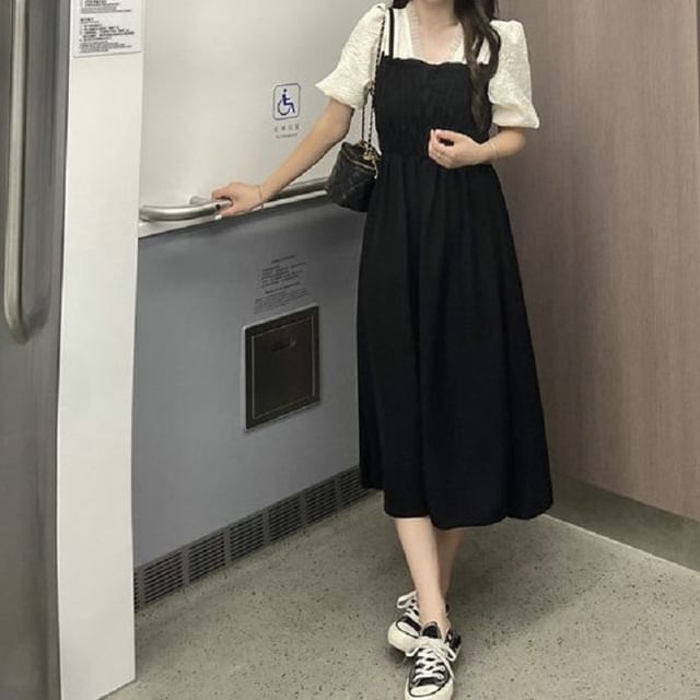 Puff Sleeve V-Neck Ruched Mock Two Piece Midi A-Line Dress