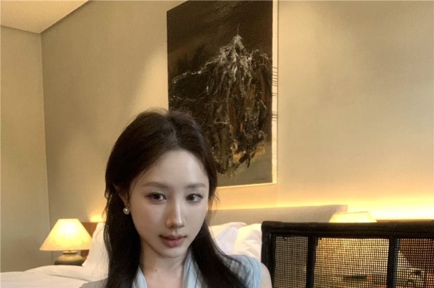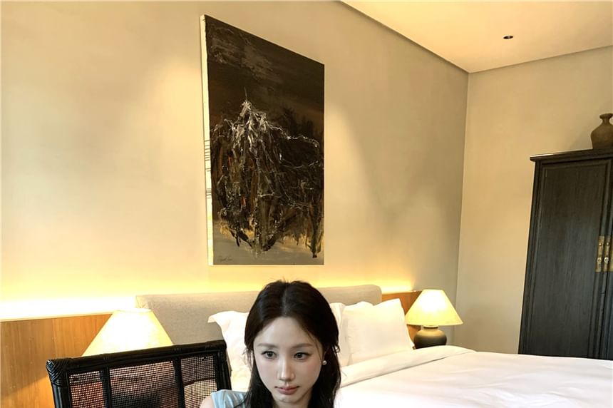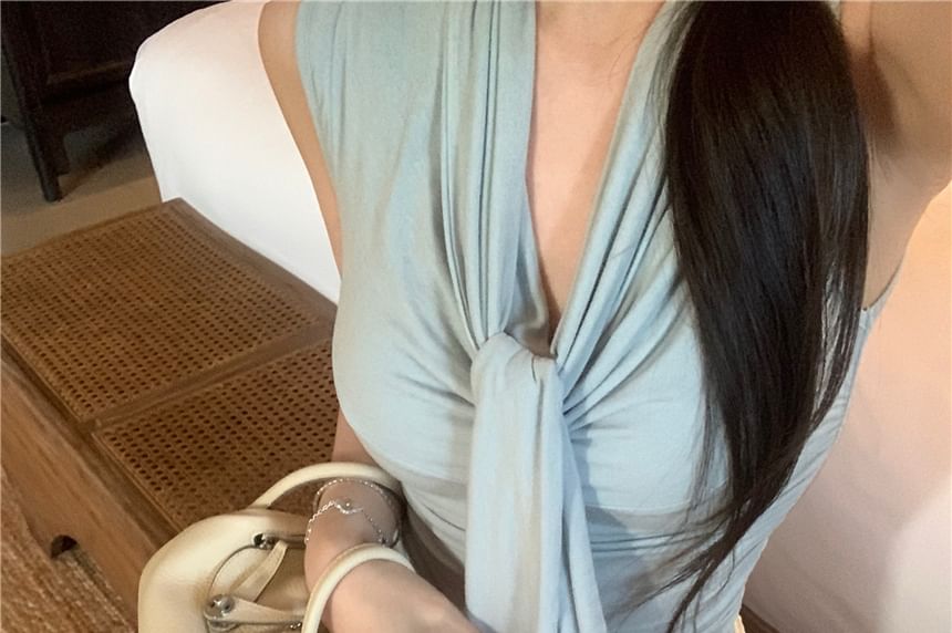 Tie-Neck Plain Tank Top / High Rise Lace Mini Pencil Skirt