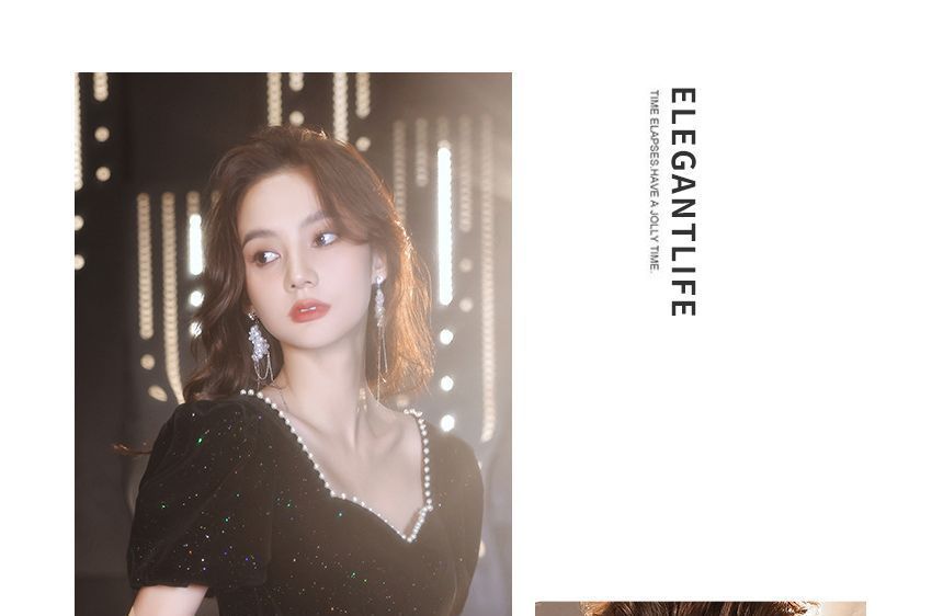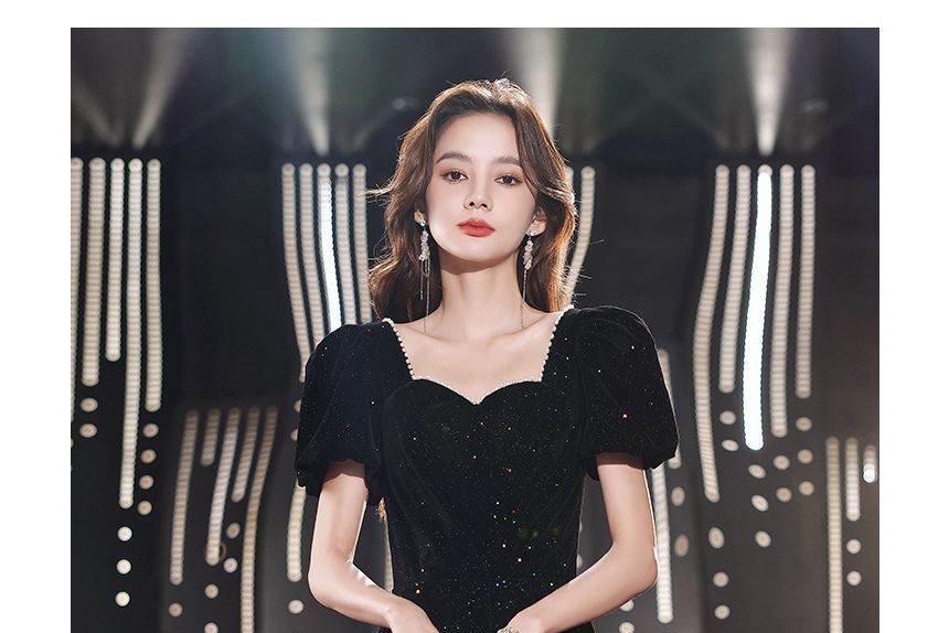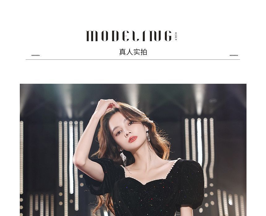 Puff-Sleeve Sweetheart Neckline Beaded Trim Glitter Prom Dress (Various Designs)