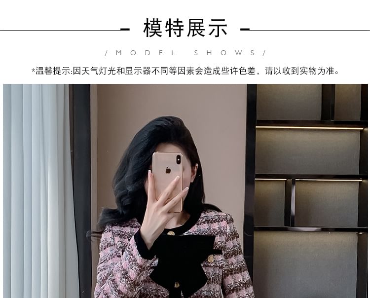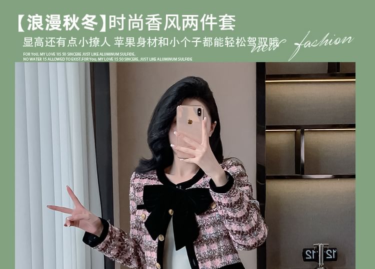 Set: Round Neck Plaid Bow Tweed Crop Button Jacket + High Waist Mini Pencil Skirt