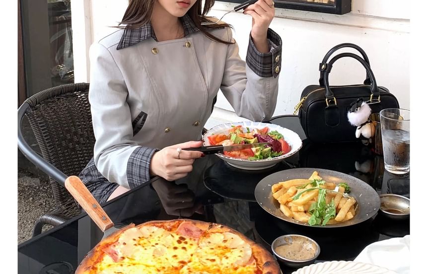 Notch Lapel Plaid Panel Cropped Double-Breasted Trench Jacket / High Waist Mini A-Line Skirt