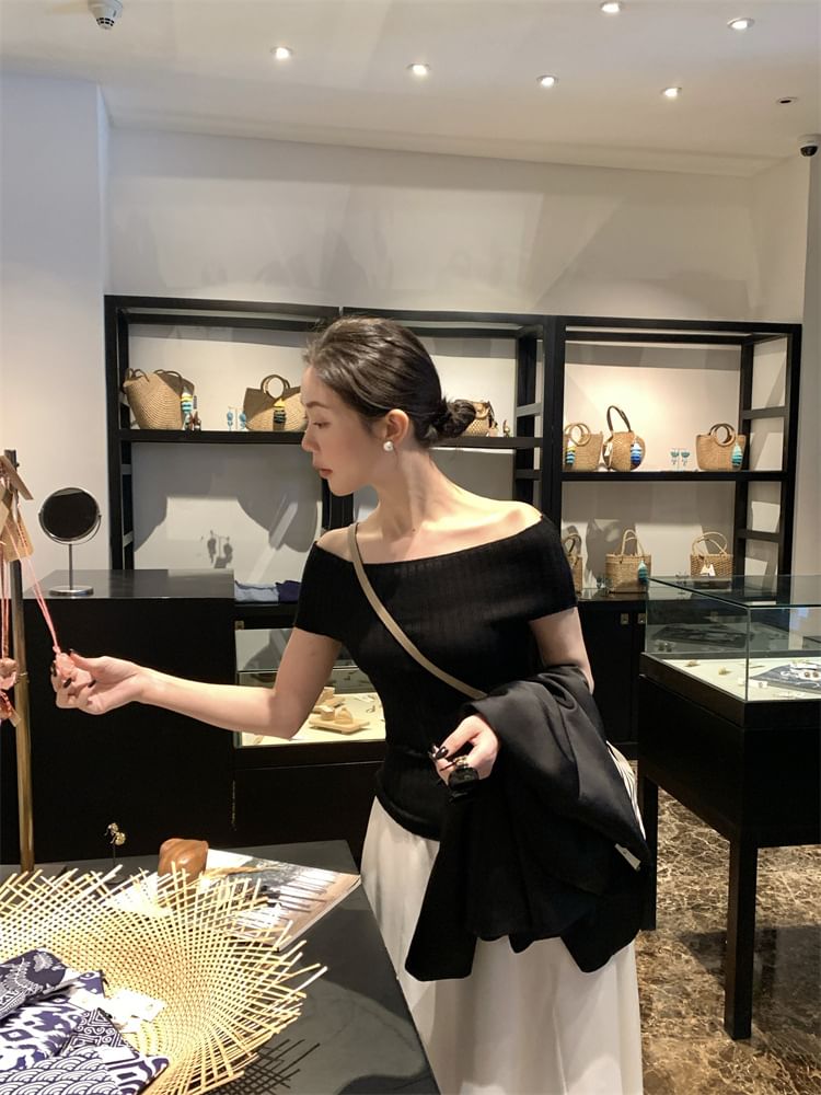 Short-Sleeve Off Shoulder Plain Ribbed Knit Top