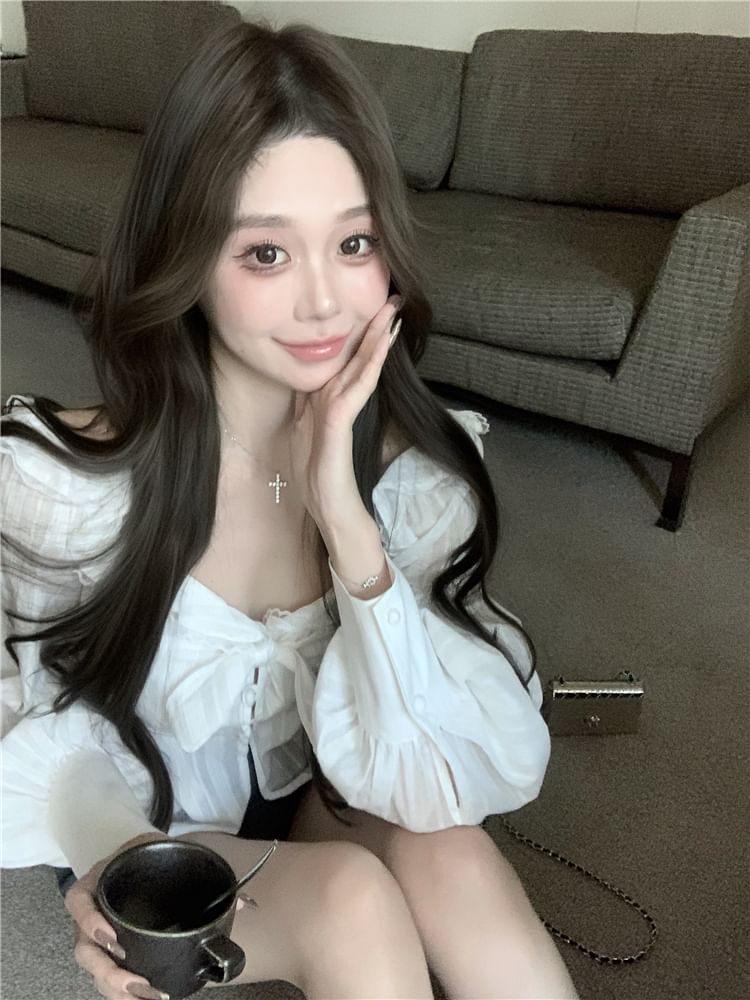 Long Sleeve V-Neck Plain Ruffle Bow Blouse