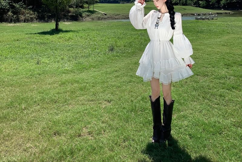 Long-Sleeve Plain Lace Trim Tiered Mini A-Line Dress