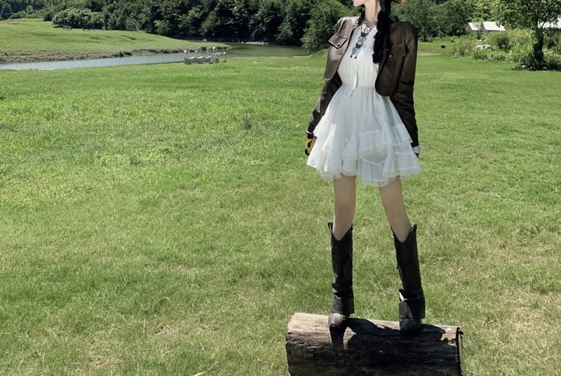 Plain Dress Lace Long-Sleeve Mini A-Line Trim Tiered