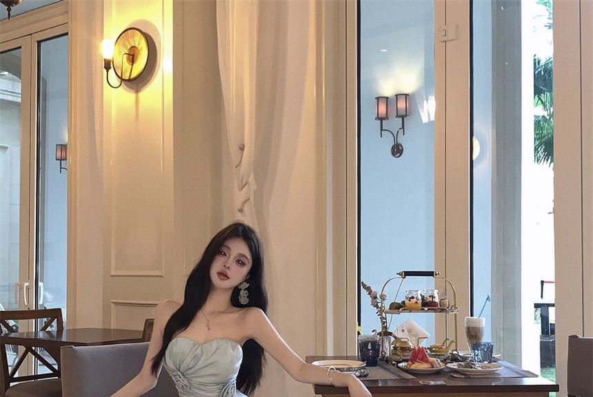 Strapless Plain Side-Slit Maxi A-Line Dress