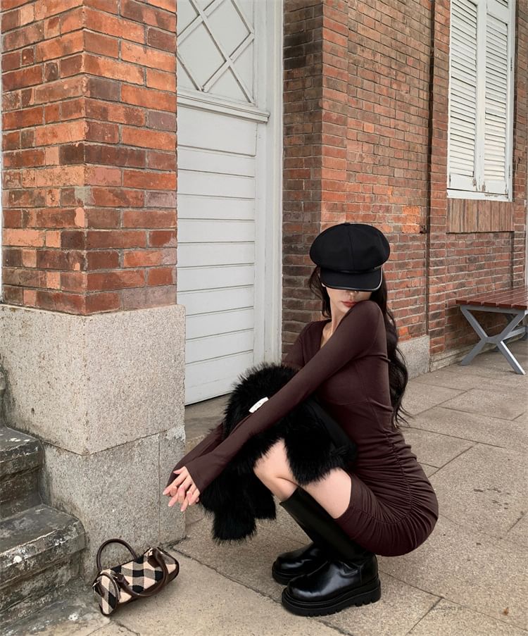 Long-Sleeve V-Neck Plain Mini Bodycon Dress