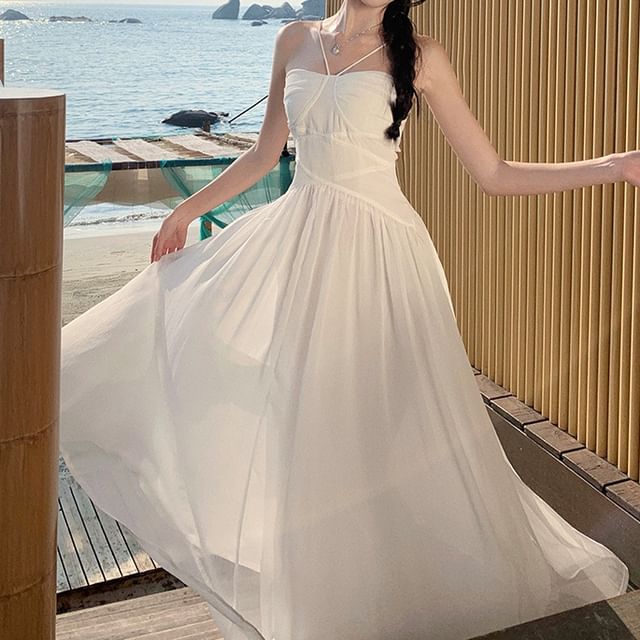 Spaghetti Strap Plain Ruched Maxi A-Line Dress