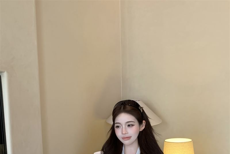 Plain Sleeve Rise Long Blouse High Neck Mini Tie Pencil Skirt / Satin