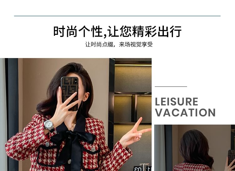 Set: Collared Houndstooth Contrast Trim Button-Up Tweed Crop Jacket + High Rise Mini A-Line Skirt