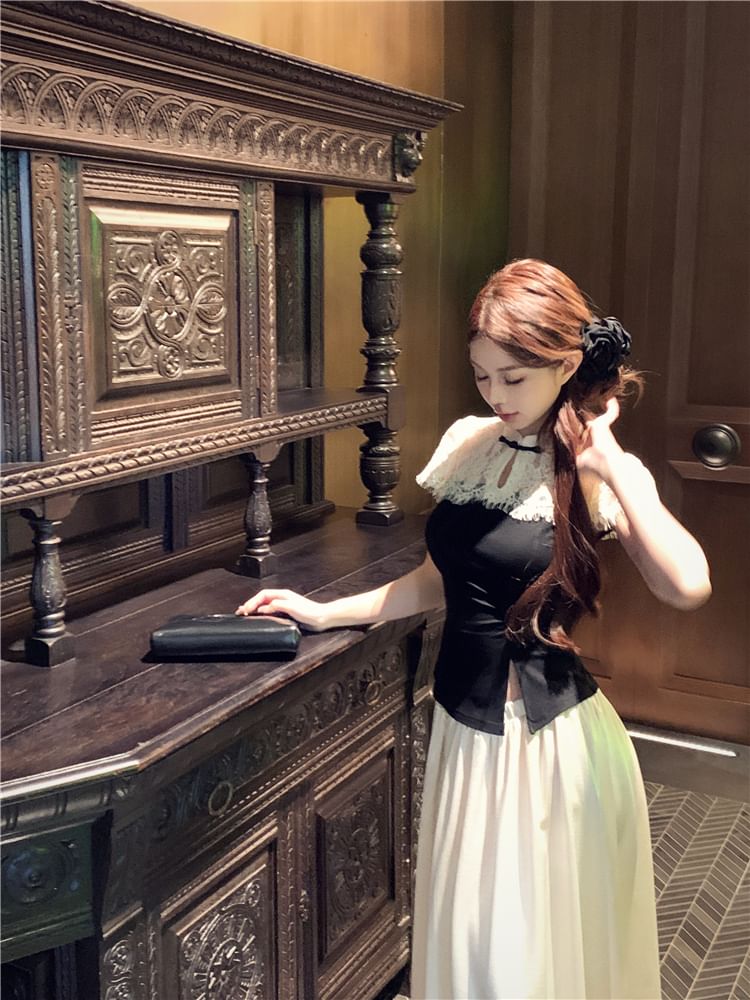 Short-Sleeve Two Tone Asymmetrical Top / High Waist Maxi A-Line Skirt