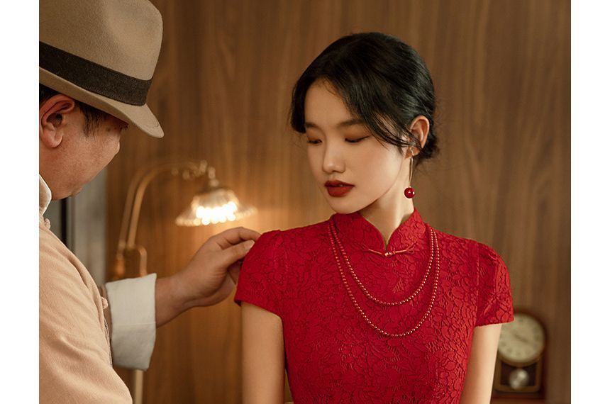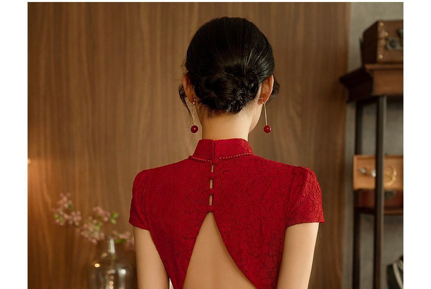 Short-Sleeve Frog Buttoned Plain Midi Sheath Dress
