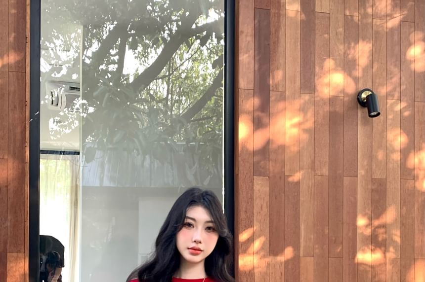 Shorts / Buckled Crew Rhinestone Plain Rise Short-Sleeve Low Neck Crop Tee