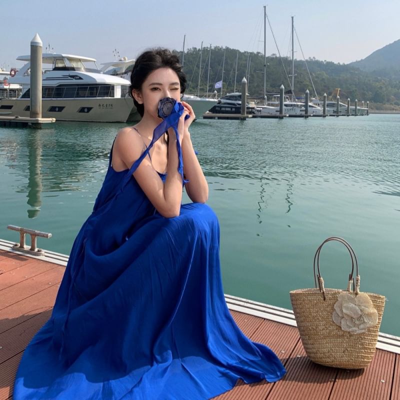 Strap A-Line Maxi Dress Ruffle Scoop Trim Neck Spaghetti Plain