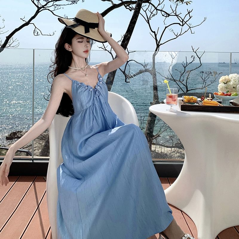 Strap Dress V-Neck Ruched Spaghetti A-Line Plain Maxi