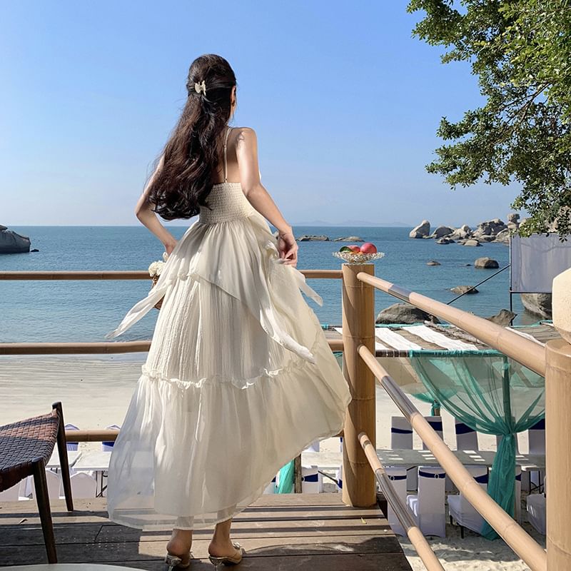 Spaghetti Strap V-Neck Plain Ruffle Trim Maxi A-Line Dress