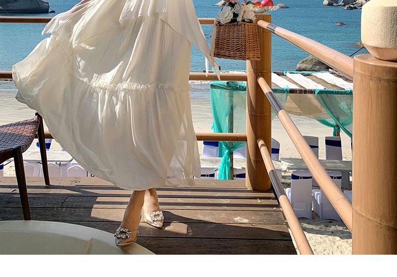 Strap Maxi Plain Ruffle Dress Spaghetti A-Line Trim V-Neck