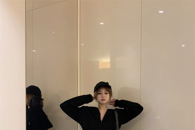 Plain Drawstring Crop Zip Hoodie / High Rise Two Tone Bootcut Sweatpants