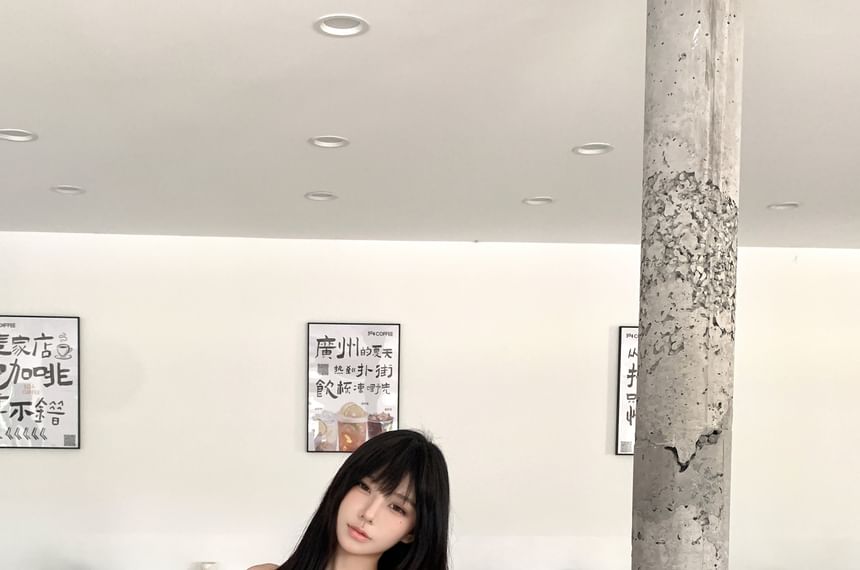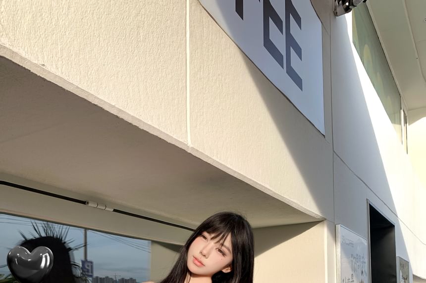 Plaid Ruched Sheer Tube Top / High Rise Bow Mini A-Line Skirt