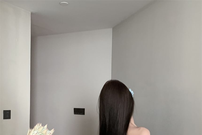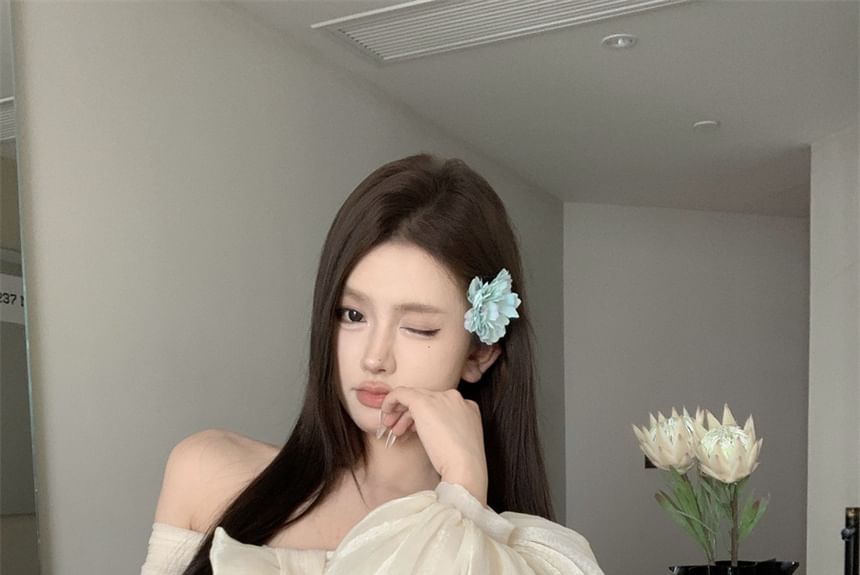 Long-Sleeve Off-Shoulder Plain Bow Accent Ruched Tunic Dress