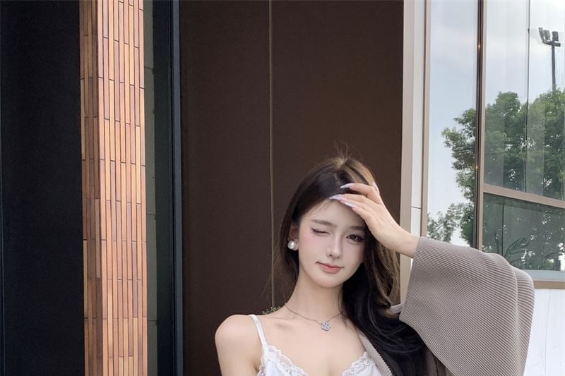 V-Neck Plain Lace Trim Camisole Top / Plain Open Front Jacket / High Waist Fringe Maxi Pencil Skirt