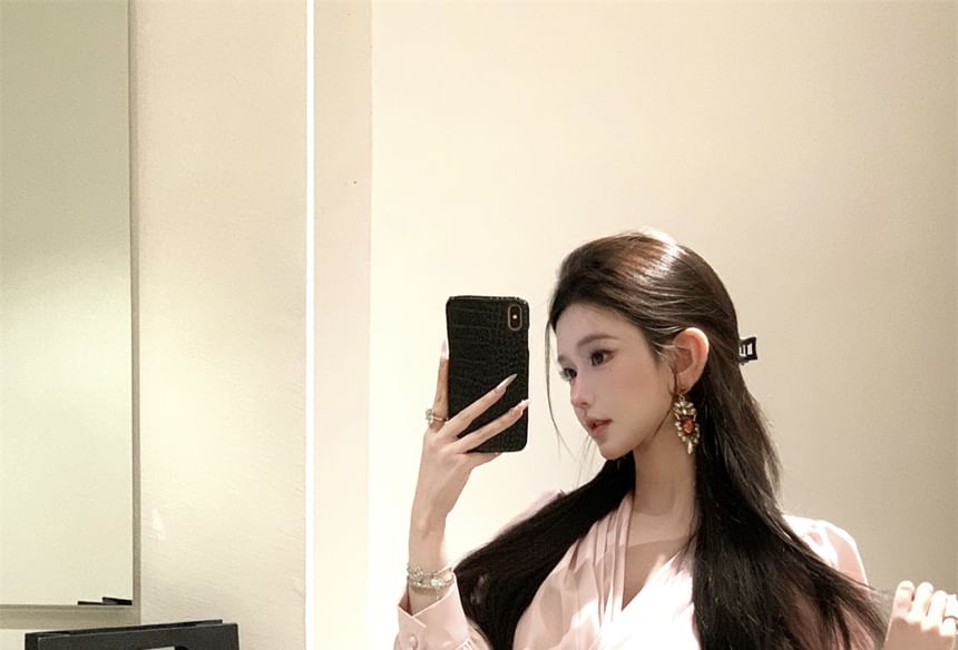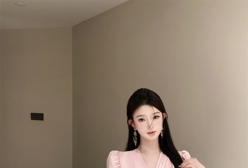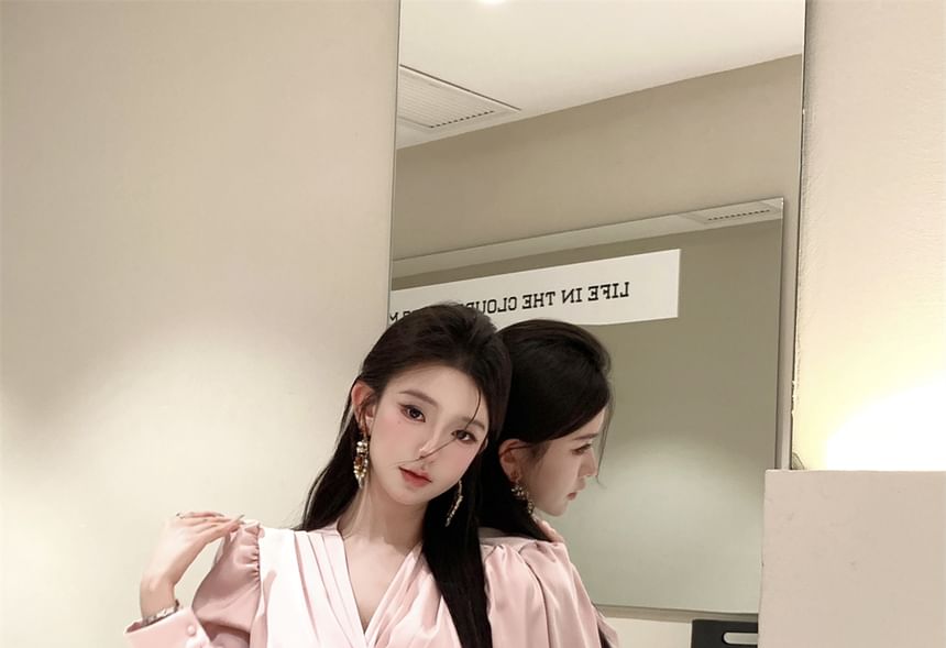 V-Neck Long Floral Sleeve Rise / High Crop Pencil Mini Applique Plain Skirt Ruched Blouse