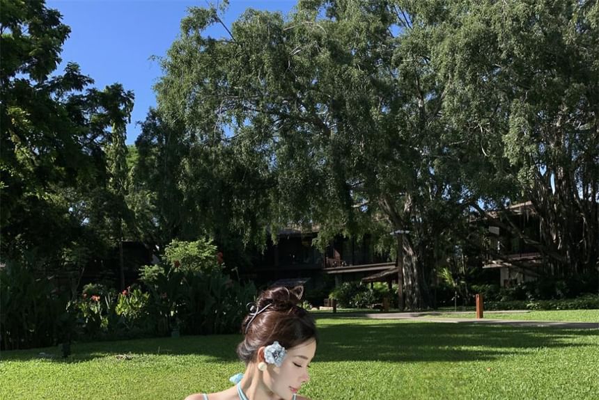 Halter Neck Plain Floral Accent Ruched Layered Open Back Maxi A-Line Dress