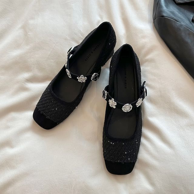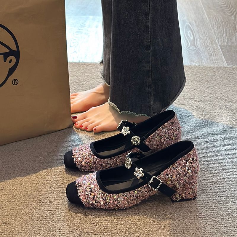 Chunky Heel Sequin Metal Accent Mary Jane Pumps