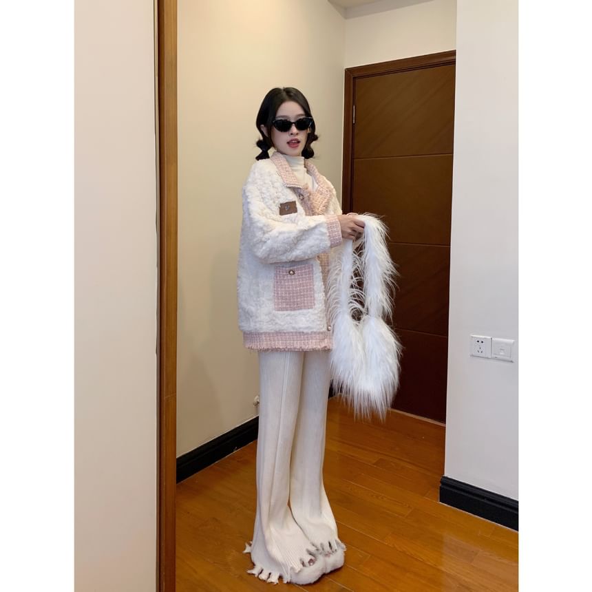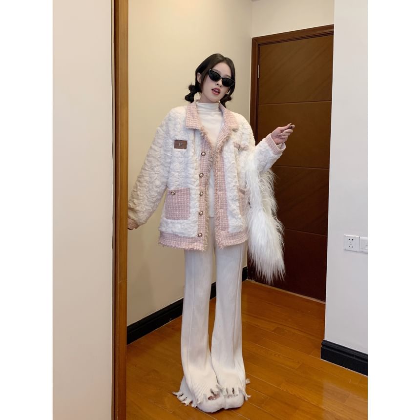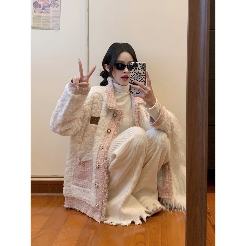 Collar Applique Fringed Tweed Panel Fleece Button Jacket
