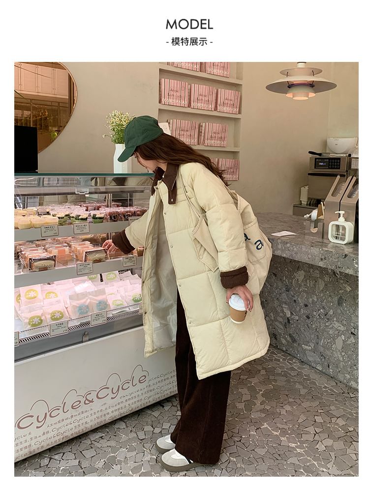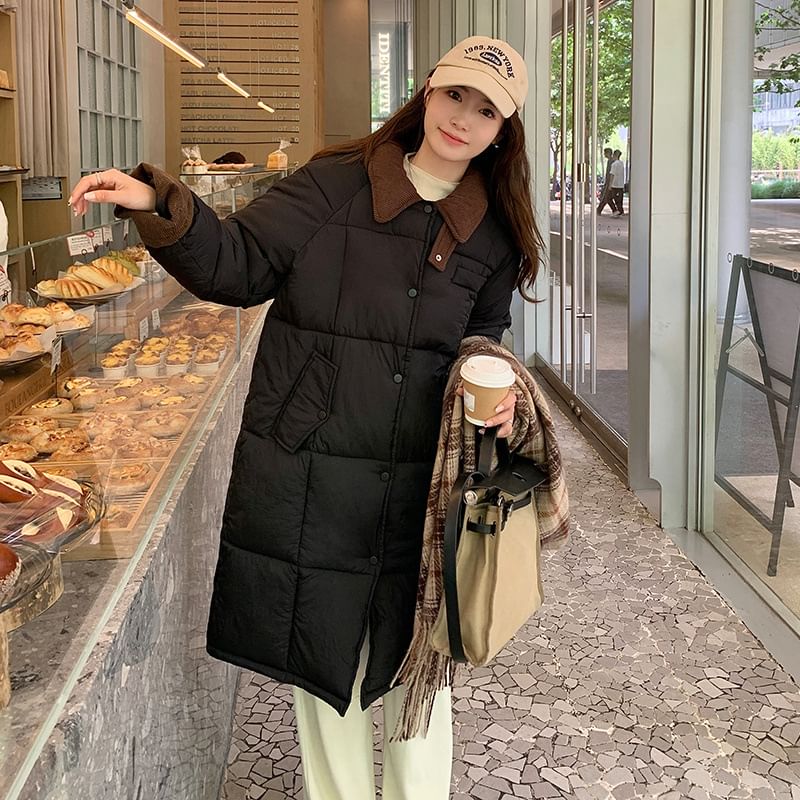 Collared Two Tone Panel Corduroy Midi Zip Puffer Coat
