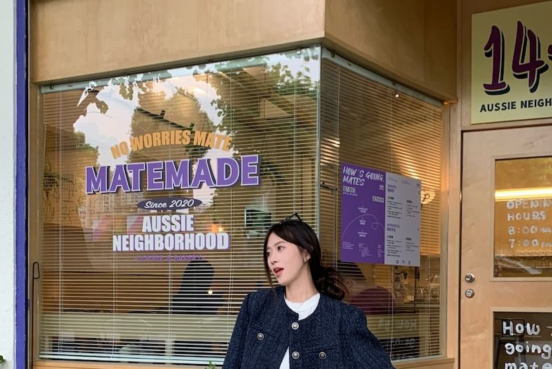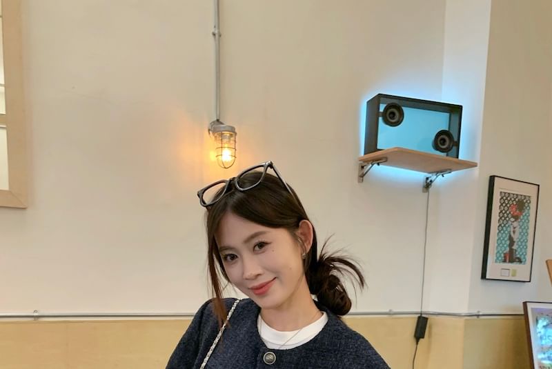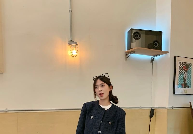 Crew Neck Plain Button-Up Tweed Crop Jacket / Mid Rise Washed Wide Leg Jeans