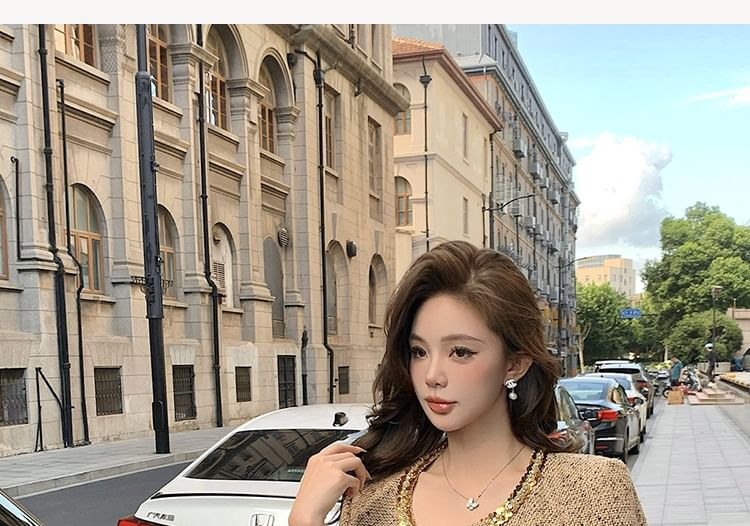Crew Neck Sequin Trim Button-Up Tweed Crop Jacket / High Rise Mini A-Line Skirt