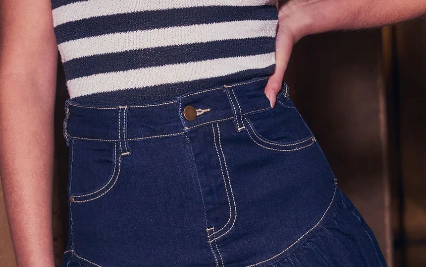 / Cropped A-Line Waist Sleeve Mini Zip-Up Jacket Long Skirt Washed High Denim