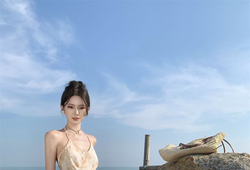 Halter Floral Ruffle Trim Open Back Maxi A-Line Dress