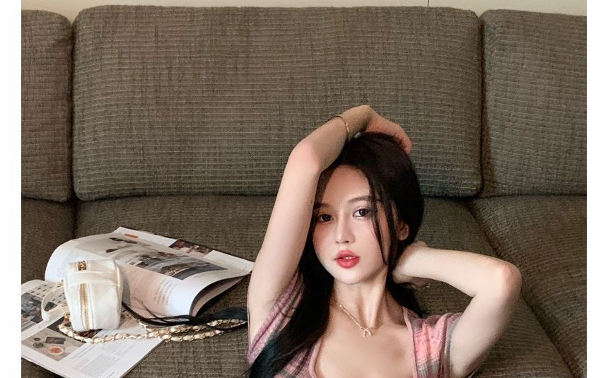 Dress Short-Sleeve Slim-Fit Mini Square-Neck Striped