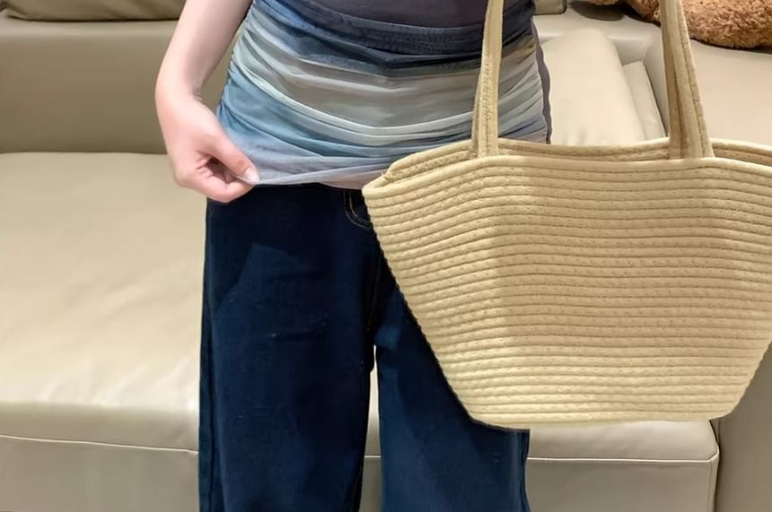 Short-Sleeve Off-Shoulder Color Block Mesh Slim Fit Top