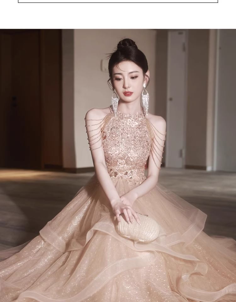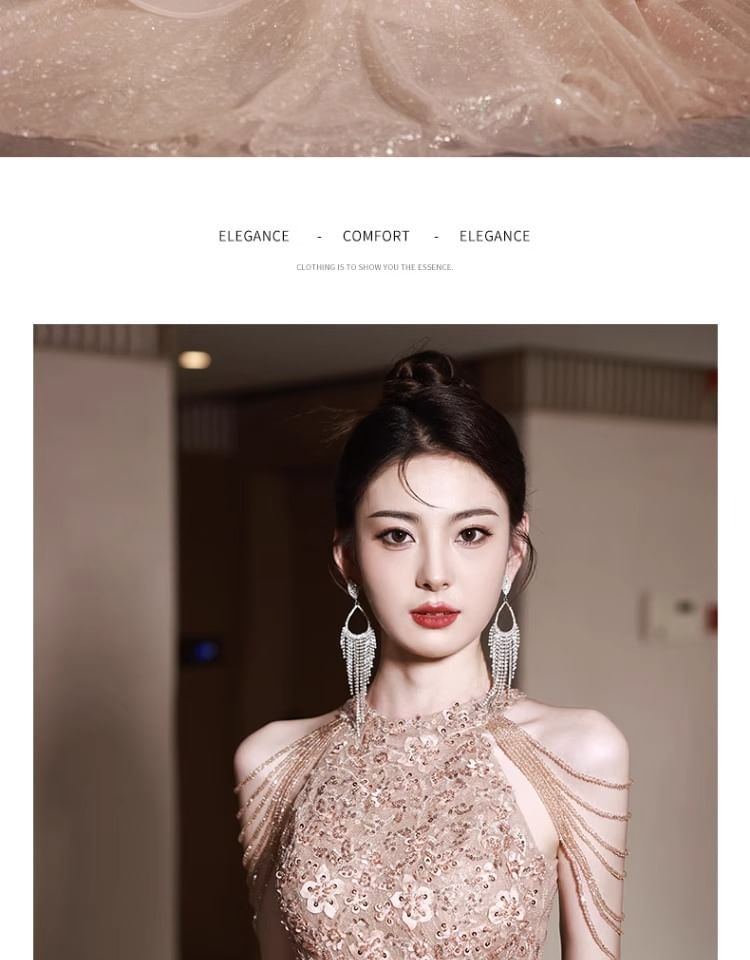 Halter A-Line Neck Layered Evening Floral Gown Fringed Sequin