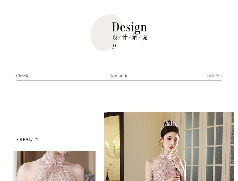 Halter Back Fringed Mock Gown Cutout Faux Neck Evening A-Line Pearl