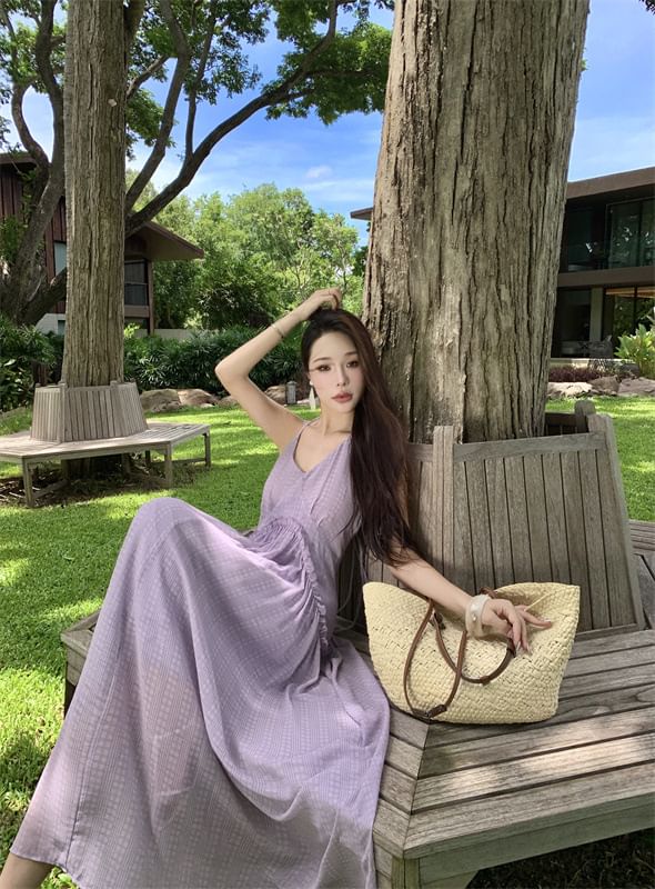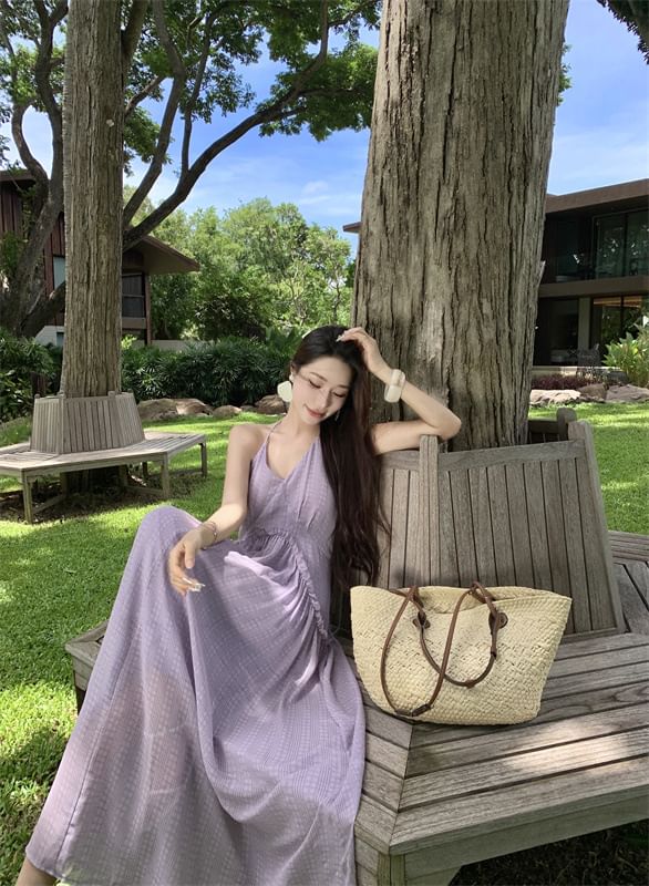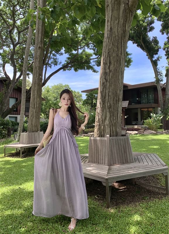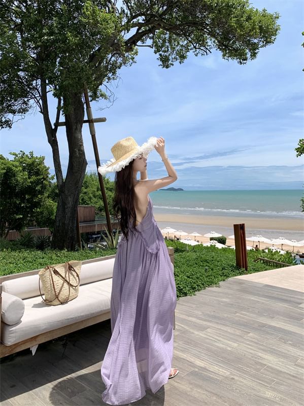Halter V-Neck Plain Frill Trim Open Back Maxi A-Line Dress