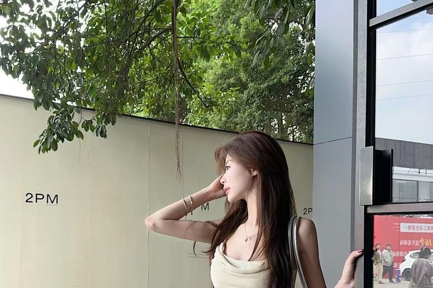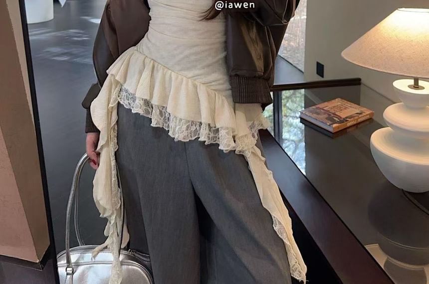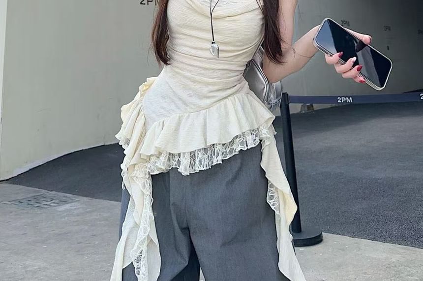 Cowl Neck Asymmetrical Lace Panel Ruffle Hem Camisole Top