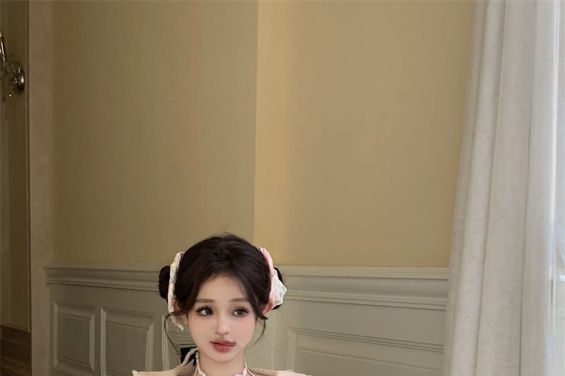 Knit Plain Lace Neck Mini Mock Apron Top Halter / Tiered Rise Set Bow Half Accent Crop Trim Skirt Two-Piece A-Line High Long-Sleeve