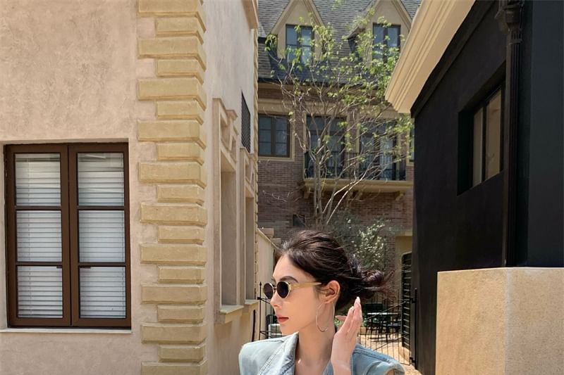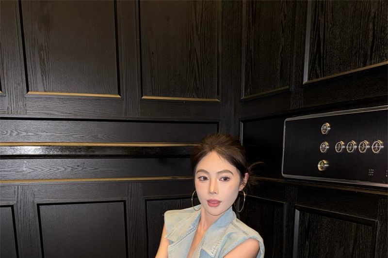 Washed Button-Up Denim Vest / High Rise Midi A-Line Layered Lace Skirt
