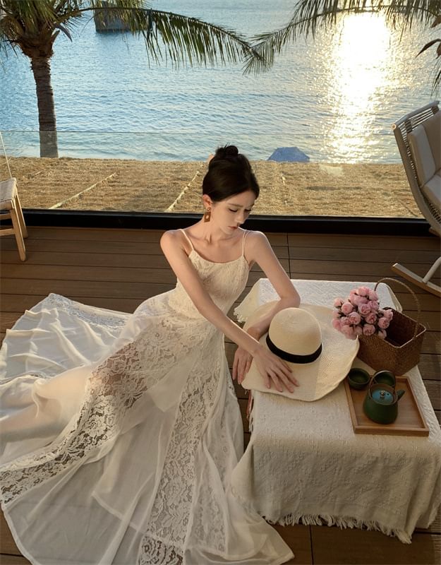Lace Open Sundress Maxi Strap Spaghetti Back Panel Plain