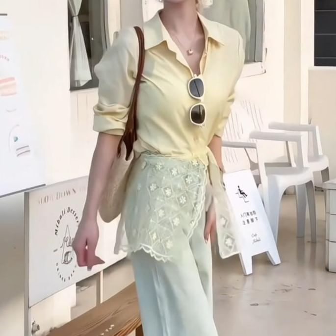 Lace Panel Sleeve Shirt Collared Long Plain Trim