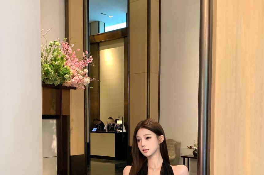 Halter-Neck Plain Button-Up Crop Top / Mid Waist Midi A-Line Lace Skirt