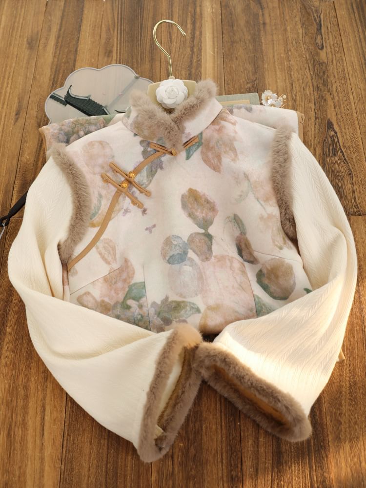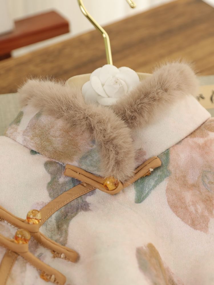 Long-Sleeve Floral Fluffy Trim Midi Qipao