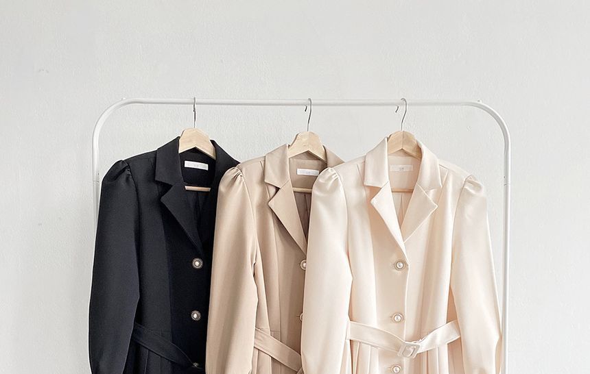 Long-Sleeve Notch Lapel Faux Pearl Button Pleated Midi A-Line Dress