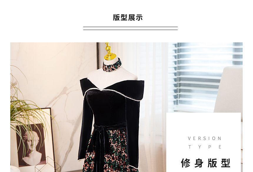 Long-Sleeve Off-Shoulder Sequin Tie Waist A-Line Evening Gown