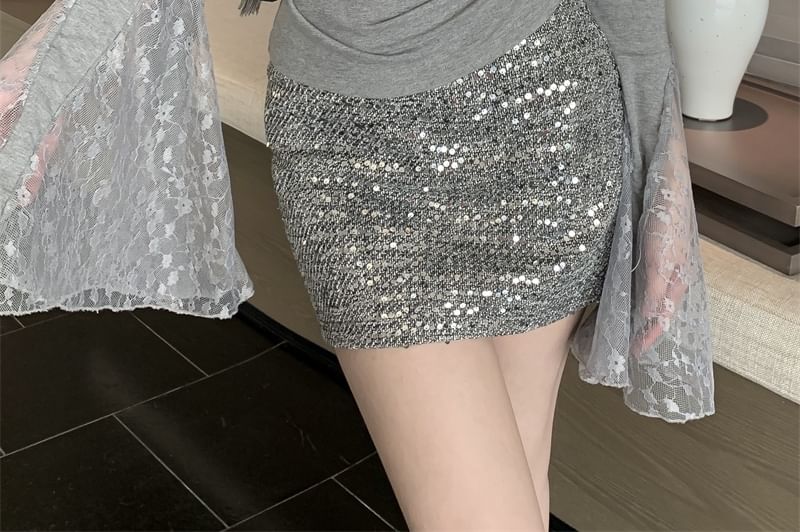Long-Sleeve Plain Off Top Shoulder Lace Panel