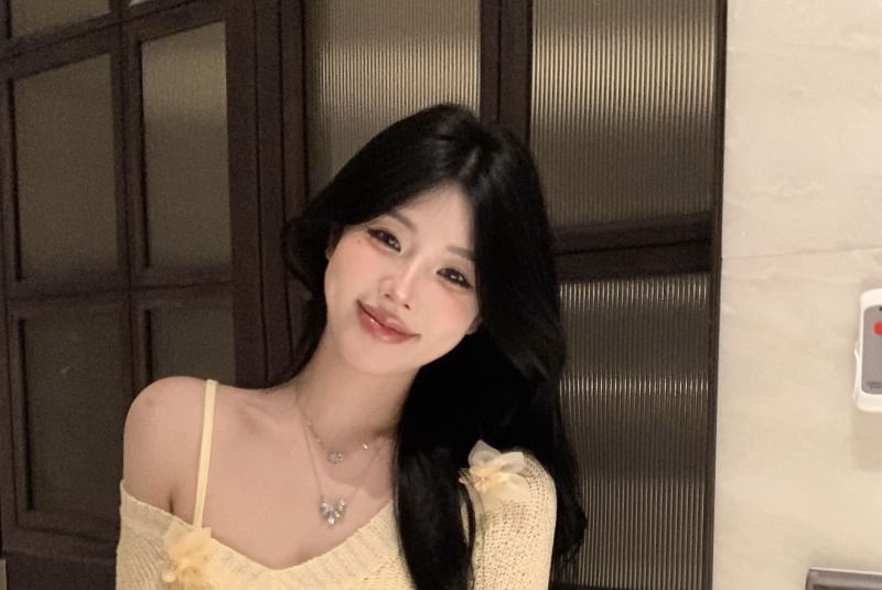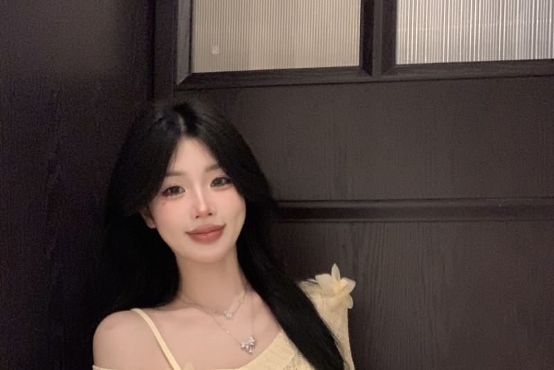 Mini Flower Dress / Neck Long-Sleeve V Sheath Knit Slip Accent